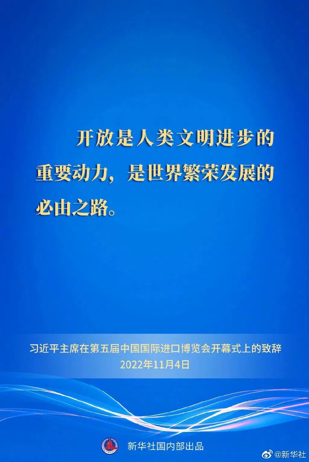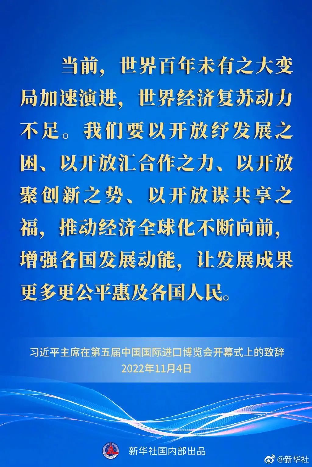 習近平強調,開放是人類文明進步的重要動力,是世界繁榮發展的必由之路。當前,世界百年未有之大變局加速演進,世界經濟復蘇動力不足。我們要以開放紓發展之困、以開放匯合作之力、以開放聚創新之勢、以開放謀共享之福,推動經濟全球化不斷向前,增強各國發展動能,讓發展成果更多更公平惠及各國人民。