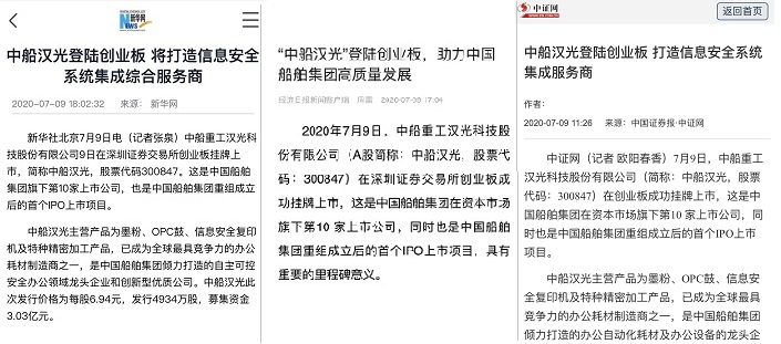 中船漢光成功上市在業內引起強烈反響,新華社、經濟日報以及中國證券報等主流媒體紛紛進行了報道。
