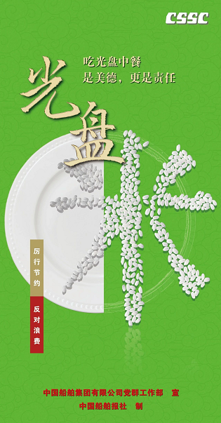 為認(rèn)真貫徹落實(shí)習(xí)近平總書記關(guān)于制止餐飲浪費(fèi)行為的重要指示精神,大力弘揚(yáng)中華民族勤儉節(jié)約、珍惜糧食的文明用餐習(xí)慣,中國船舶集團(tuán)積極開展“制止餐飲浪費(fèi) 踐行光盤行動(dòng)”專項(xiàng)宣傳引導(dǎo)活動(dòng)。