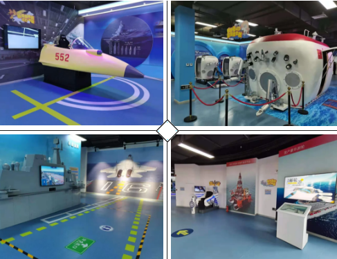 整個展館內(nèi)分布著護(hù)航體驗區(qū)、VR綜合體驗區(qū)、航母艦室漫游體驗區(qū)、近海VR鉆井平臺體驗區(qū)、艦載機(jī)起飛體感指揮體驗區(qū)、航母艦載機(jī)空體驗區(qū)等,可以讓參觀者模擬駕駛我國船海重器,親身感受搏浪滄海、護(hù)衛(wèi)海疆的震撼與自豪,使得船舶館成為海洋特色鮮明、模型館藏豐富、互動體驗感強(qiáng)的軍事科普教育展館和軍事文化娛樂園區(qū)。