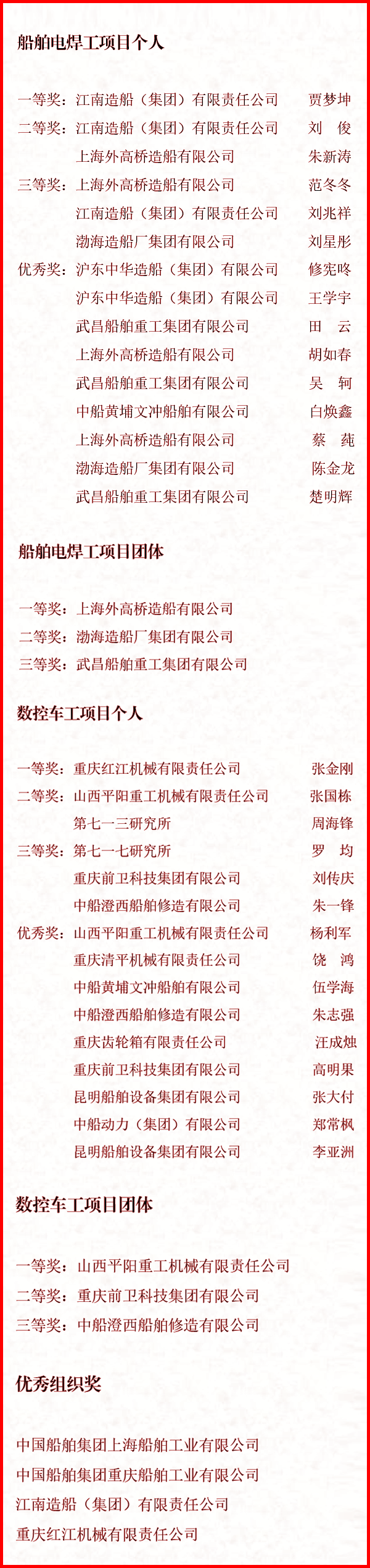 9月27日至9月30日,中國船舶集團有限公司聯(lián)合中國就業(yè)培訓技術(shù)指導中心,在上海、重慶兩地成功舉辦了國家二類競賽——“2021年全國行業(yè)職業(yè)技能競賽—中國船舶集團有限公司職業(yè)技能競賽”。來自49家成員單位共計128名選手同臺角逐,最終評選出個人及團體一、二、三等獎和個人優(yōu)秀獎,優(yōu)秀組織獎等獎項。