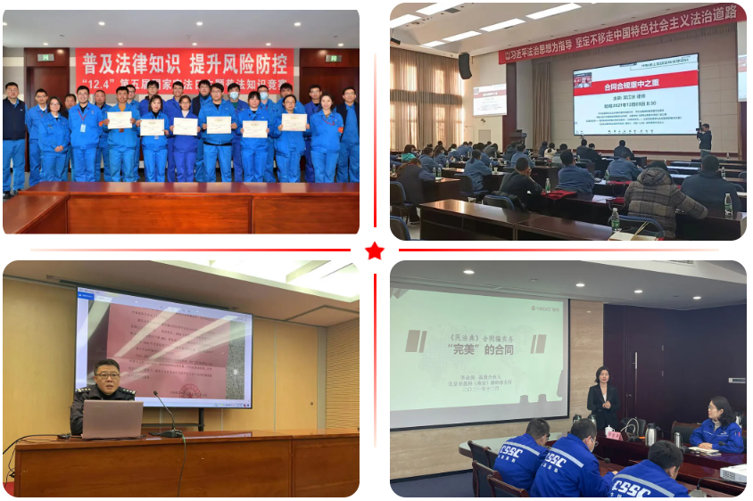 ▲ 大船集團、廣船國際、外高橋造船、風帆公司、九江公司、前衛科技、汾西重工、深圳研究院、七二六所等單位通過內部報刊、宣傳展板、海報、電子屏幕、OA平臺等開展法治宣傳;中國海裝、中船貿易、上海公司、重慶公司、武漢重工、綜合院等單位充分運用微信公眾平臺、微信群等互聯網媒介對憲法、民法典等進行宣傳解讀。