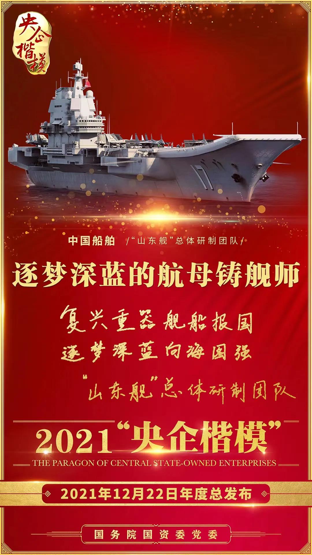 12月22日,國務院國資委黨委舉行2021年第二批“央企楷模”發布暨年度總發布儀式,中國船舶“山東艦”總體研制團隊榮獲2021年“央企楷?!睒s譽稱號。繼“奮斗者”號萬米載人潛水器研發團隊獲評2020年“央企楷?!睒s譽稱號后,中國船舶集團再獲此殊榮。