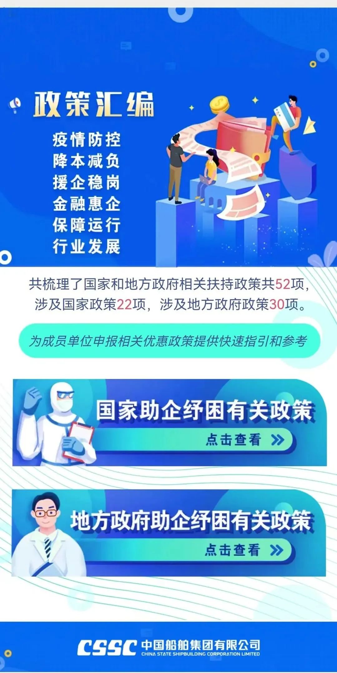 今年新冠疫情發(fā)生以來,為支持企業(yè)應對疫情防控、加快復工達產(chǎn),國務(wù)院、相關(guān)部門、相關(guān)地方政府出臺了一系列助企紓困政策。集團公司對這些政策進行了梳理,共涉及相關(guān)支持政策52項(其中,國家支持政策22項地方支持政策30項),供成員單位查閱參考。