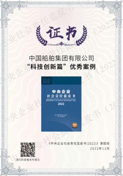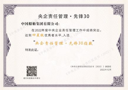2022年12月20日,由國務院國資委社會責任局主辦、中國社會責任百人論壇承辦的“新征程 新責任——《中央企業社會責任藍皮書(2022)》《國資國企社會責任藍皮書(2022)》發布活動”在京舉行。活動以“云端會議”的方式舉辦,發布了“央企責任管理 · 先鋒30指數”,中國船舶集團入選該指數。