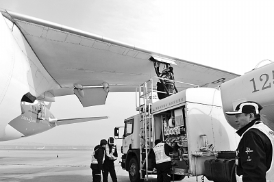 11月21日,在北京首都國際機場,工作人員為海南航空HU497航班的波音787客機加注生物航煤。(新華社發)