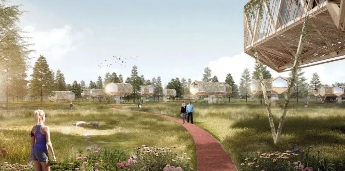 ????“棠上人家”方案以“浮木”為概念,旨在創(chuàng)造一種漂浮于自然之上、如樹木般生長的建筑形態(tài)。設(shè)計以鄉(xiāng)村建設(shè)的天然環(huán)境保護(hù)和不規(guī)則點狀供地特點為切入點,提出立足鄉(xiāng)村、面向未來的輕型建造策略,對結(jié)構(gòu)選型、空間組合、表皮構(gòu)造等方面進(jìn)行研究,打造綠色生態(tài)的新型鄉(xiāng)村建筑形態(tài)。