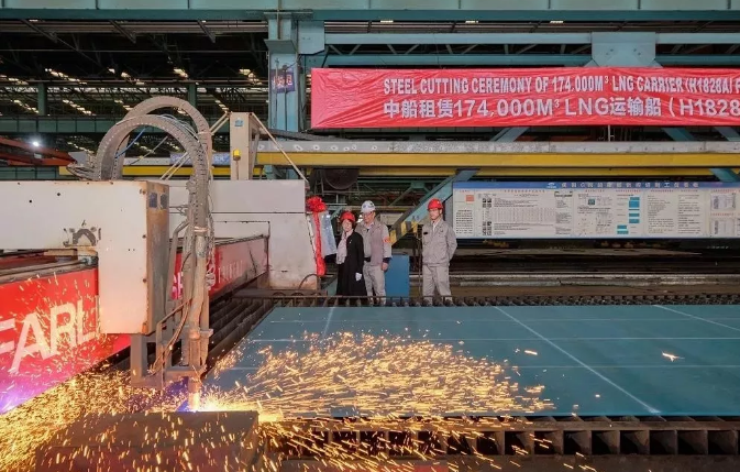 ????近日,中國船舶集團(tuán)所屬滬東中華造船(集團(tuán))有限公司為中船租賃建造的17.4萬方LNG(液化天然氣)運(yùn)輸船(H1828A)順利開工。