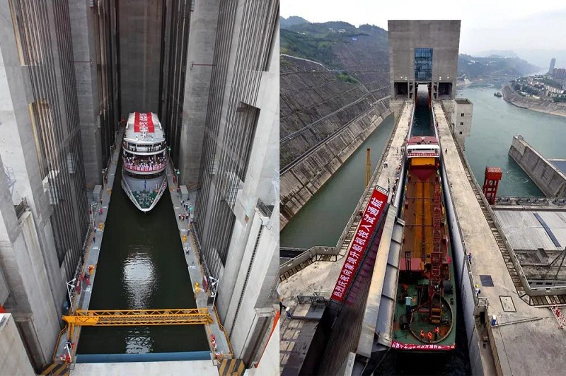 三峽升船機(jī)(左)是目前世界上技術(shù)難度和規(guī)模最大的升船機(jī),向家壩升船機(jī)(右)是目前世界上已投入運(yùn)行中提升高度最大的升船機(jī)