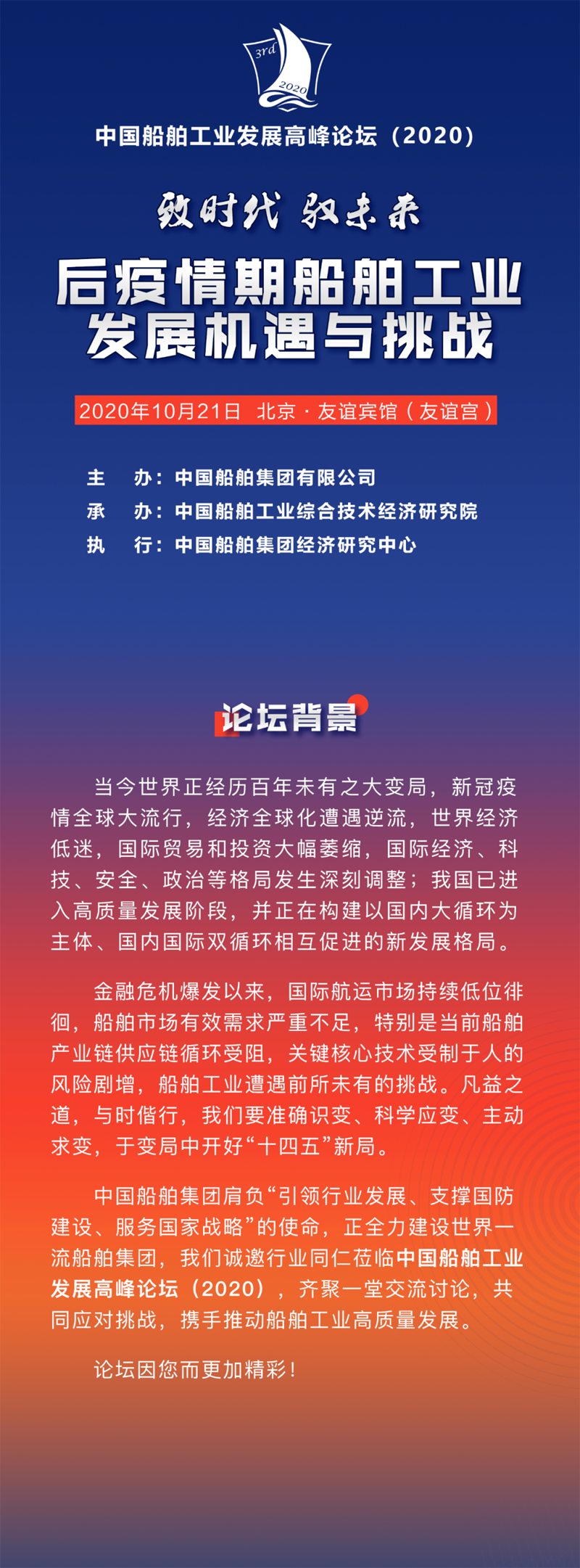 中國船舶集團肩負“引領行業發展、支撐國防建設、服務國家戰略”的使命,正全力建設世界一流船舶集團,我們誠邀行業同仁蒞臨中國船舶工業發展高峰論壇(2020),齊聚一堂交流討論,共同應對挑戰,攜手推動船舶工業高質量發展。