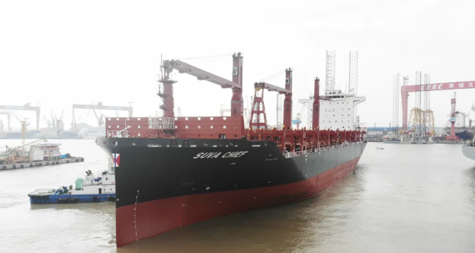 1月4日上午,交付的“SUVA CHIEF”號,這是黃埔文沖攜手中船貿(mào)易為新加坡太古公司建造的2750TEU集裝箱船3號船。