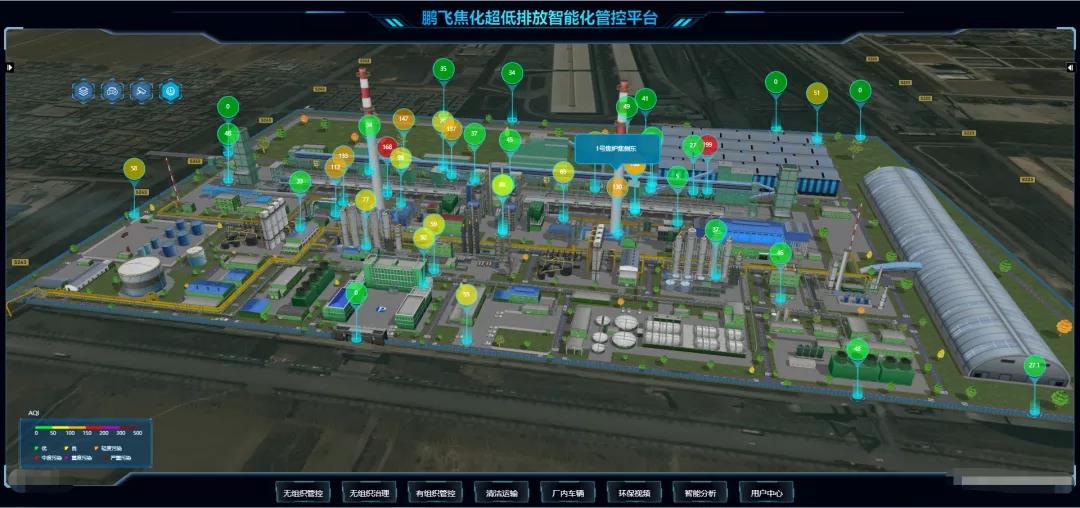 一體化管控平臺項目以焦化行業超低排放政策和生態環境部重污染天氣應急減排評級政策為依據,采用物聯網、三維數字建模、視覺AI聯動、三屏聯動等先進技術,打造業內領先的“有組織排放+無組織排放+清潔運輸”環保管控治一體化平臺系統,精準動態監測污染源,顯著提升企業內部環境管理效率,降低企業發展的環境風險。