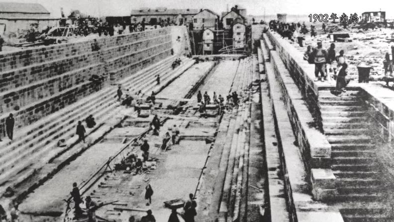 修船南塢始建于1899年,1902年底初建完工,長116米、寬13米、深7.6米,采用兩開式扉門,并配備電動排水泵。