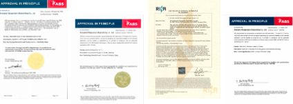 從左至右依次為21萬噸紐卡斯爾型甲醇燃料動力散貨船、9200車雙燃料動力汽車運輸船(PCTC)、創新型30萬噸原油輪(VLCC)、115萬載重噸氨燃料油輪的AIP證書