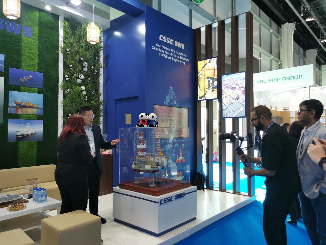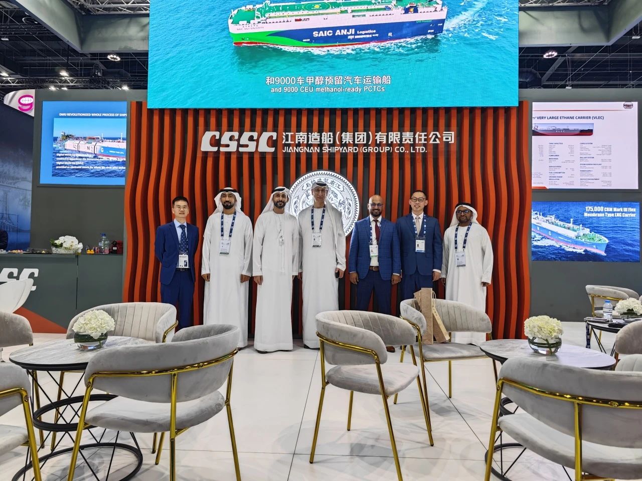 在此次展會上,江南造船展出了自主研發設計的17.5萬立方米液化天然氣(LNG)運輸船、目前世界上最大艙容的99000立方米超大型乙烷運輸船(VLEC)以及93000立方米超大型液氨運輸船(VLAC)等船型,憑借自身優勢及特色展臺布置吸引了眾多油氣公司、船東、船級社、中間商、船廠、供應商等駐足觀看,同時也與其進行了廣泛和深入的交流。值得一提的是,中國駐阿聯酋大使一行也到訪江南造船展臺,詳細詢問江南造船的產品特點、技術和建造優勢。