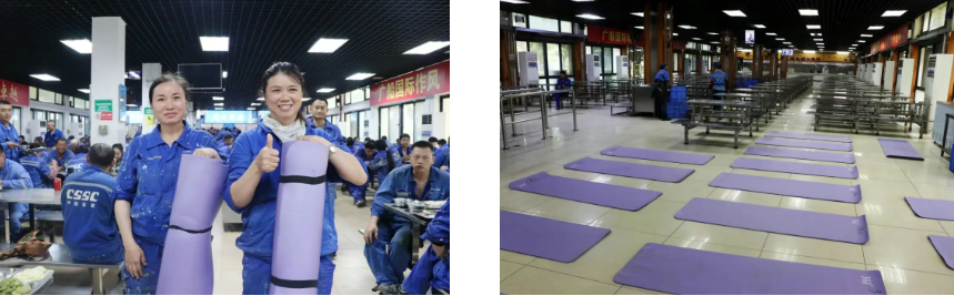 中午時分,走進廣船國際生產指揮樓食堂,十幾臺空調已經提前開啟,食堂內涼爽舒適。據介紹,該公司已經將會議室、食堂等公共區域開放給一線員工作為午間的“休憩港灣”,讓一線員工得以安心小憩、恢復體力。13個食堂內,除了不銹鋼凳子、桌子可以供員工躺下休息之外,還為員工準備了瑜伽墊。