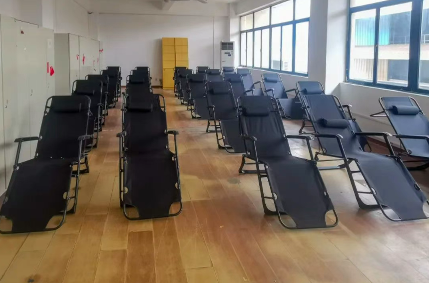 外高橋造船對現有場地資源進行優化改造,在辦公樓、食堂等17處區域為員工設立了休息區域,為高溫天奮戰在一線的職工提供舒適、充足的納涼空間。休息點設有空調、風扇等降溫設備,并根據各部門使用環境,配備折疊床、涼席等物資,滿足一線職工高溫休息需求。
