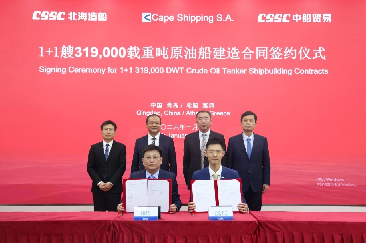 簽約儀式在青島與雅典同步舉行,標(biāo)志著北海造船在綠色大型油船建造領(lǐng)域再次取得重要突破,充分體現(xiàn)了船東對(duì)北海造船品牌與油船建造質(zhì)量的高度認(rèn)可,也進(jìn)一步鞏固和提升了中船集團(tuán)在大型油船建造領(lǐng)域的市場(chǎng)份額與全球競(jìng)爭(zhēng)力。