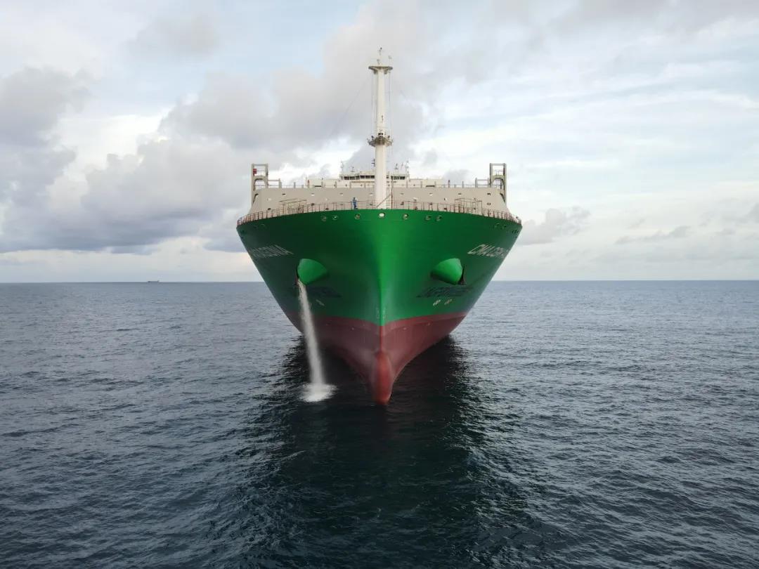 采用薄膜型燃料艙、雙燃料推進。以LNG為主要燃料,采用了中國船舶集團自主品牌主機雙燃料WinGD主機,配置了GTT MARK III薄膜式燃料艙,容量達14000立方米,可支持船舶往返亞歐航線。