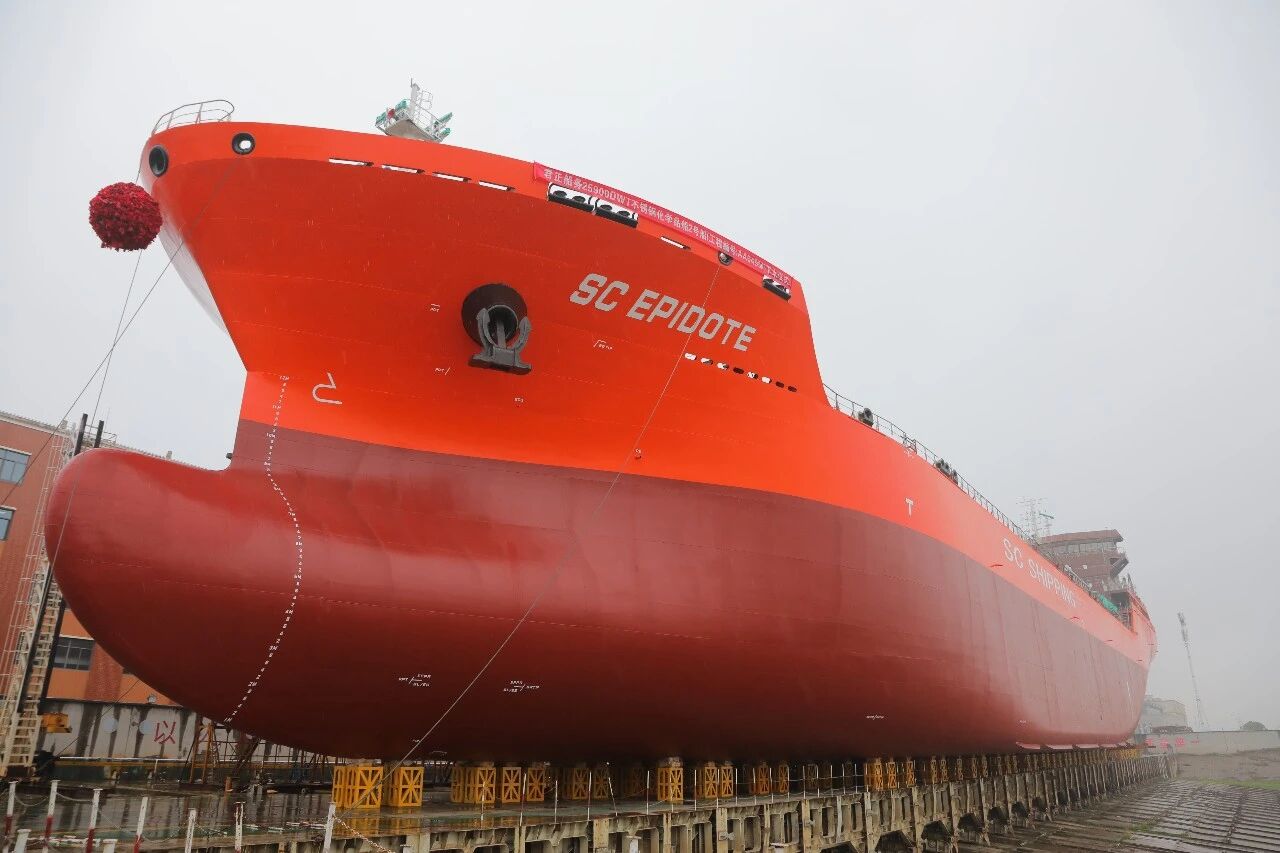 3月16日,武昌造船為上海君正船務有限公司建造的25900載重噸不銹鋼化學品船2號船(系列船6號船)順利下水,在高端不銹鋼化學品船領域的批量化、節拍化建造能力邁上新臺階。該型船擁有10對液貨艙和1對污油艙,兼具低能耗、高載貨量與高度智能化優勢,主要用于化學品、成品油運輸。