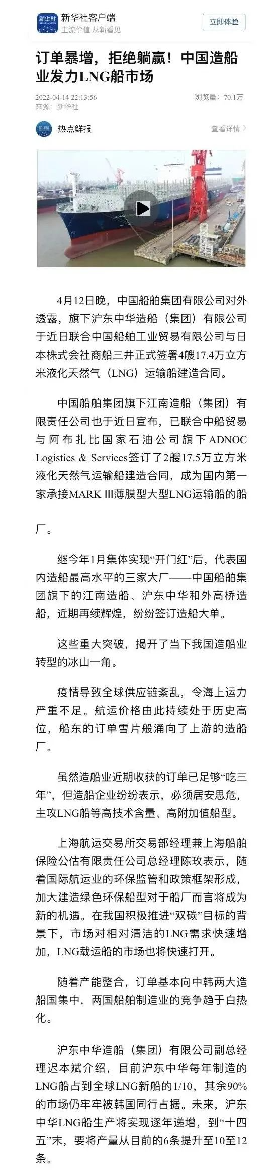 近日,新華社以《訂單暴增,拒絕躺贏!中國造船業發力LNG船市場》為題,關注了中國船舶集團發力LNG船市場接連簽訂造船大單的重大突破!