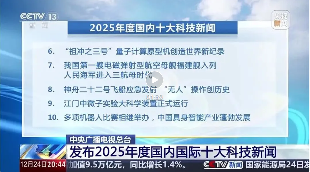 12月24日,中央廣播電視總臺發(fā)布2025年度國內十大科技新聞,我國第一艘電磁彈射型航空母艦福建艦入列人民海軍進入三航母時代位列其中。