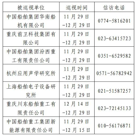 根據中國船舶集團黨組2023年第二輪巡視工作部署,截至2023年11月29日,巡視工作已經鋪開。其中,對中國船舶集團華南船機有限公司、重慶前衛科技集團有限公司、中國船舶集團汾西重工有限責任公司、杭州應用聲學研究所、上海船舶電子設備研究所等5家單位開展常規巡視,對重慶川東船舶重工有限責任公司、中國船舶重工集團新能源有限責任公司等2家單位開展專項巡視。